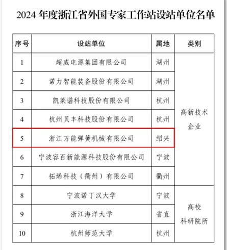 19th 12.2024 在全球化與科技創(chuàng)新的驅動下,浙江省外國專家工作站成為吸引國際高端人才、推動企業創(chuàng)新發(fā)展的重要平臺。自2020年《浙江省外國專家工作站管理辦法》實施以來,紹興市在吸引外籍專家方面取得了顯著成績。截至目前,紹興市已有6家單位獲批為省級外國專家工作站,位居全省前列。 2024年,浙江萬能彈簧機械有限公司榮...